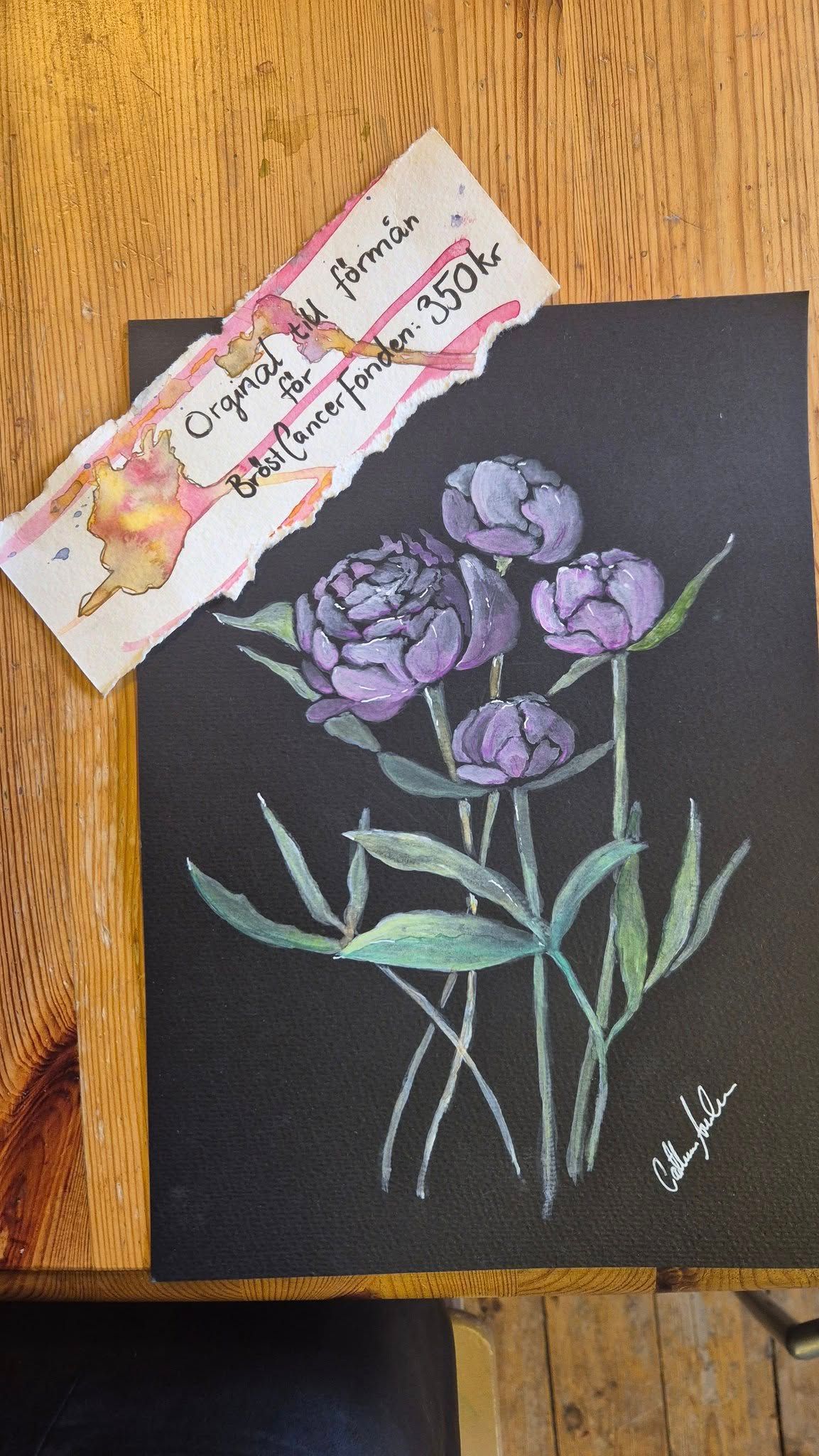 Och utöver det har jag målat en rosa pion på svart akvarellpapper som jag säljer i Galleriet i samband med Rosa Bandet kampanjen. Där har man chans att köpa ett original för 350 kr och hälften går direkt till Cancerfonden. Hoppas någon tar med sig den hem och samtidigt bidrar till en bättre värld.